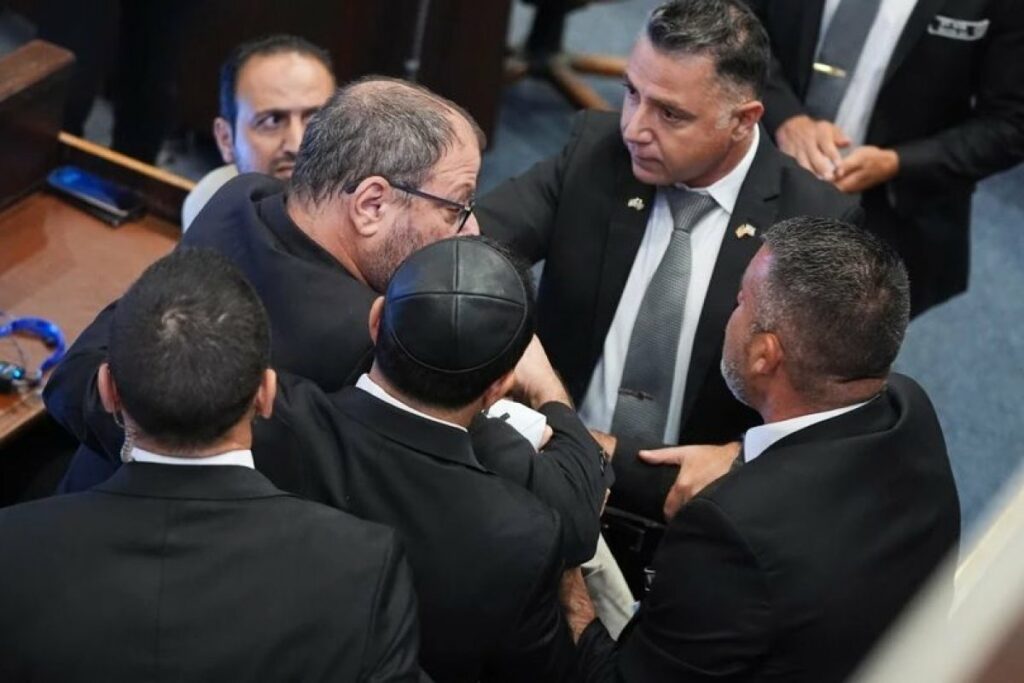 Ajman Odeh, arapsko-izraelski poslanik i predsjednik stranke Hadaš Tala, držao je transparent na kojem je pisalo “Priznajte Palestinu” prije nego što je izbačen. Poslanik partije Ofer Kasif je takođe udaljen iz parlamenta, prenose mediji.