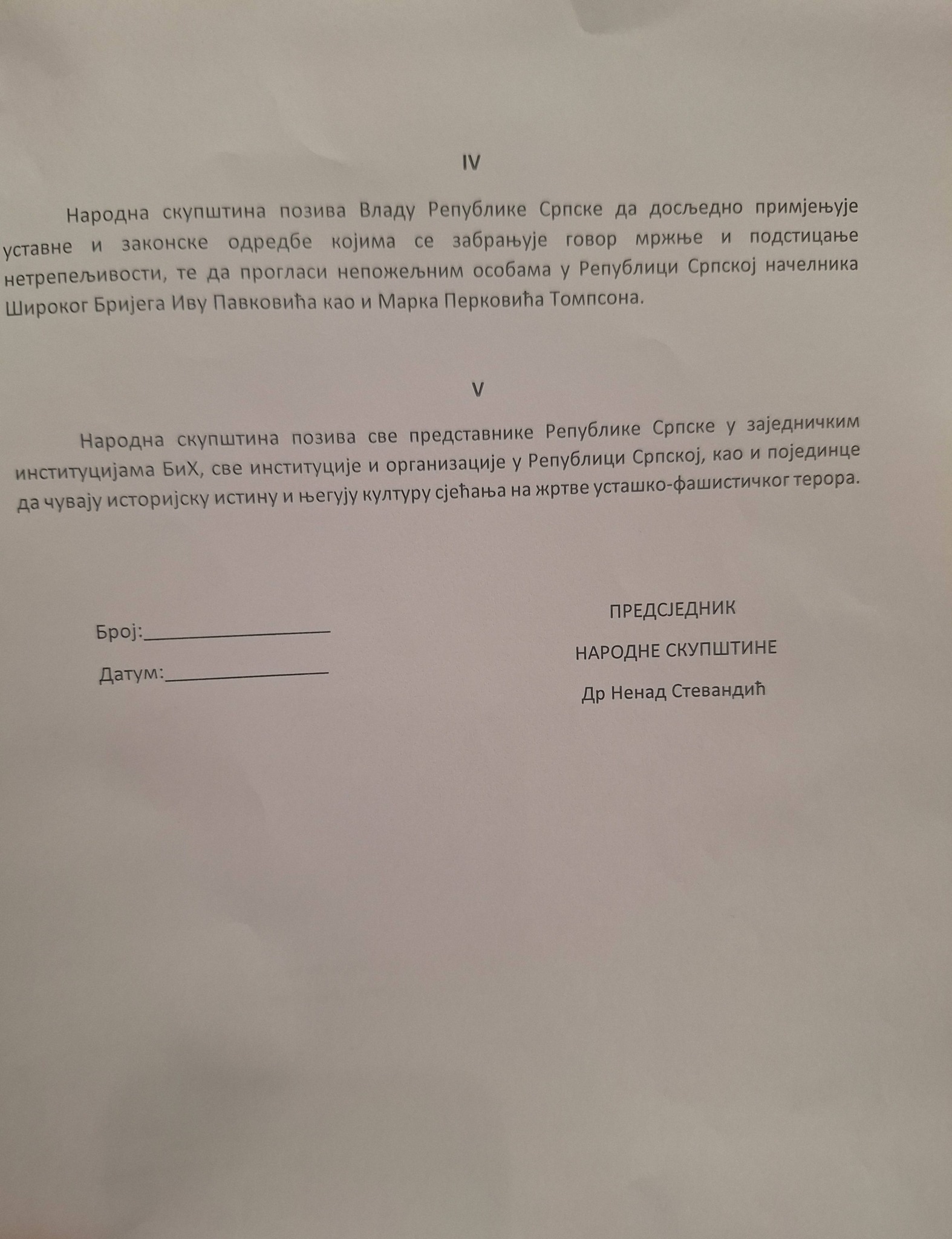 – Narodna skupština poziva Vladu Republike Srpske da dosljedno primenjuje ustavne i zakonske odredbe kojima se zabranjuje govor mržnje i podsticanje netrpeljivosti i da proglasi nepoželjnim osobama u Republici Srpskoj načelnika opštine Široki Brijeg Ivu Pavkovića, kao i Marka Perkovića Tompsona – trebalo bi da stoji u rezoluciji prema mišljenju SDS.