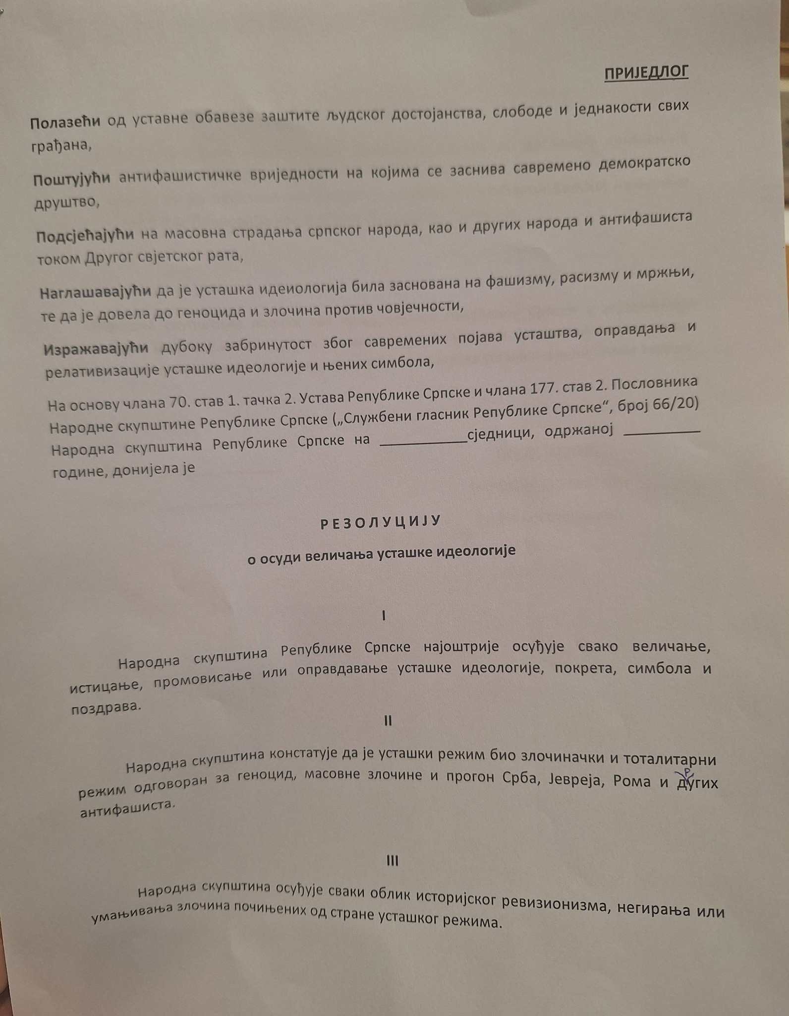 – Narodna skupština konstatuje da je ustaški režim bio zločinački i totalitarni režim odgovoran za genocid, masovne zločine i progon Srba, Jevreja, Roma i drugih antifašista – navodi se u prijedlogu rezolucije.