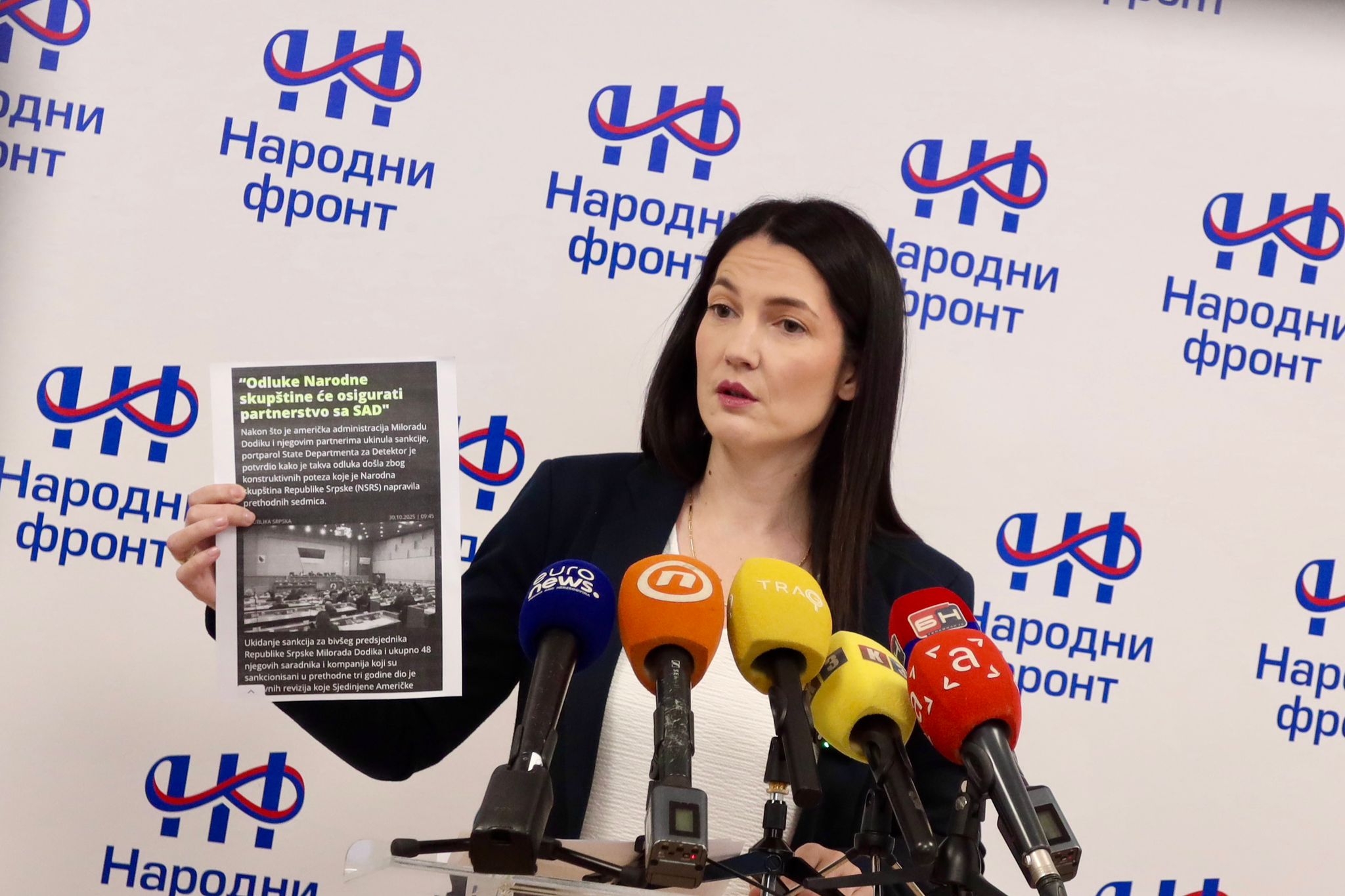 „Nakon ukidanja sankcija vrhu SNSD-a i Miloradu Dodiku, jasno je da je to dobijeno nakon izdaje u Narodnoj skupštini u prošlu subotu, 18.10. ove godine, a što su jutrošnjim saopštenjem potvrdile Sjedinjene Države“, izjavila je ovo na pres konferenciji, Jelena Trivić, predsjednica Narodnog fronta komentarišući aktuelnu političku situaciju.