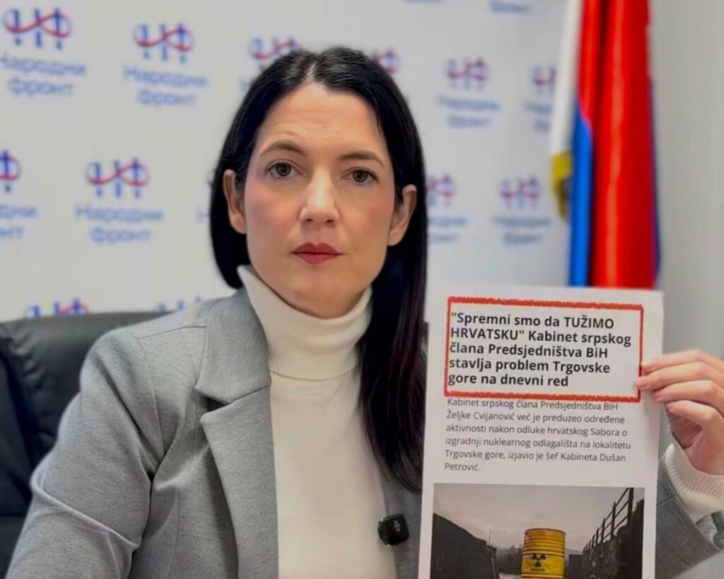 Predsjednica Narodnog fronta Jelena Trivić pozdravila je najavu iz kabineta srpskog člana Predsjedništva Bosne i Hercegovine da su spremni da pitanje Trgovske gore stave na dnevni red prve naredne sjednice Predsjedništva BiH i da pokrenu tužbu Bosne i Hercegovine protiv Republike Hrvatske zbog namjere da na samoj granici sa BiH odlaže radioaktivni i nuklearni otpad.