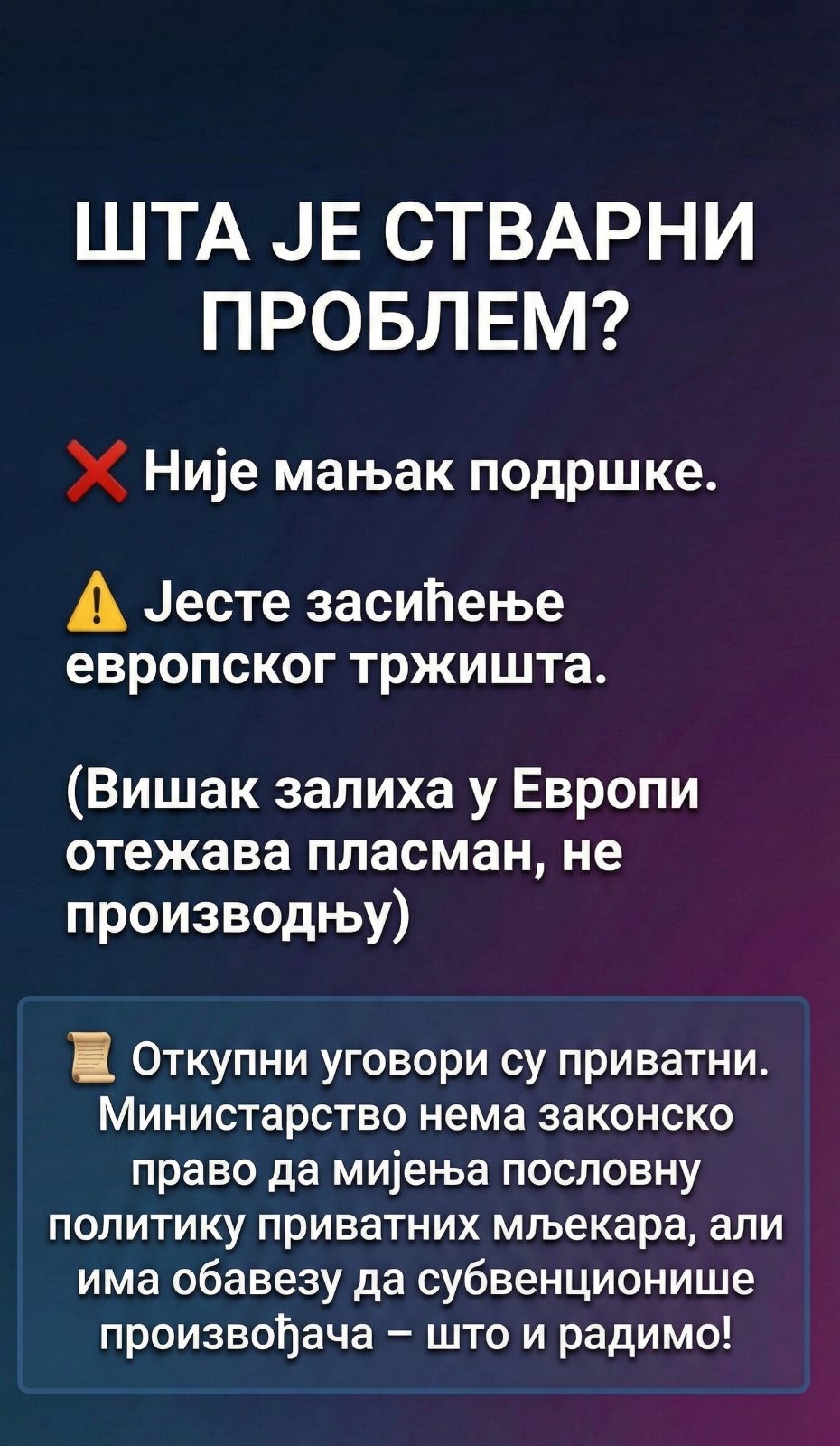 Iz resornog ministarstva ističu da razumiju svaki izazov mljekara i da znaju da poremećaji na evropskom tržištu i stvaranje zaliha unose nemir u njihove domove.